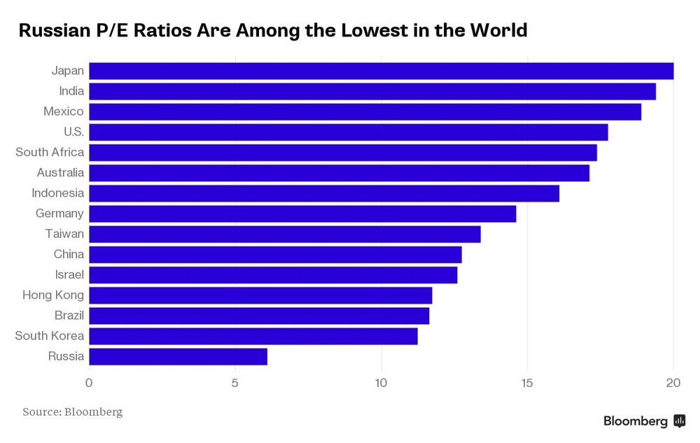 3. Низкий цены кратные к прибыли: В то время как российские акции часто торгуются ниже номинальной стоимости по сравнению с мировыми аналогами, на фоне неуверенности инвесторов в устойчивости компании. Сейчас акции торгуются даже дешевле исторических значений. По данным агентства Bloomberg, на ближайшие 12 месяцев индекс ММВБ оценивается в 5,9 раза выше прибыли или на 51% ниже среднего показателя для развивающихся рынков. Средний дисконт за последние пять лет составлял 44%.