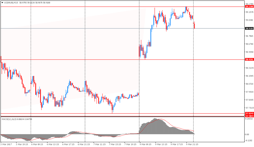 Индекс доллара США, показывающий отношение доллара к корзине из шести основных валют, опустился на 0,63%, до уровня 101,34. Катализатором снижение доллара был доклад по рынку труда США, который не в полной мере оправдал завышенные ожидания участников рынка. Министерство труда сообщило, что в феврале число рабочих мест в несельскохозяйственном секторе выросло на 235 000 мест, поскольку строительный сектор зафиксировал самый большой прирост почти за 10 лет из-за необычно теплой погоды. Экономика создала на 9 000 рабочих мест больше в декабре и январе, чем сообщалось ранее. За последние три месяца занятость в среднем составила 209 000 человек. Экономика должна создавать примерно 100 000 рабочих мест в месяц, чтобы идти в ногу с ростом населения трудоспособного возраста. Резкий подъем найма в прошлом месяце сопровождался устойчивым ростом зарплаты, при этом среднечасовая заработная плата выросла на 6 центов, или на 0,2 процента. Рост заработной платы в январе был пересмотрен до 0,2% от 0,1%. Это привело к росту зарплаты в годовом исчислении до 2,8% с 2,6%. Уровень безработицы упал на 0,1%, до 4,7%, даже несмотря на то, что все больше людей выходят на рынок труда, чему способствует наемный труд. Экономисты прогнозировали увеличение занятости на 190 000 рабочих мест. С учетом того, что рынок труда достиг почти полной занятости, рост зарплаты может ускориться, поскольку компании вынуждены повысить компенсацию, чтобы сохранить работников и привлечь квалифицированных работников. По мнению экономистов, рост зарплаты в размере от 3% до 3,5% необходим для того, чтобы поднять инфляцию до целевой ставки ФРС в размере 2%. Но инфляция уже усиливается, частично по мере роста цен на сырье. Рост инфляции, наряду с ужесточением ситуации на рынке труда, бумом на фондовом рынке и укреплением мировой экономики, заставил некоторых экономистов надеяться, что ФРС увеличит ставки гораздо быстрее, чем ожидают рынки. Согласно рынку фьючерсов, вероятность повышения ставки ФРС на мартовском заседании составляет 90,8%.