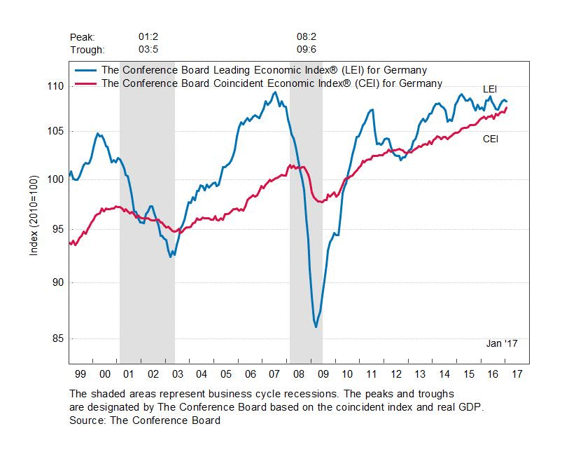 Результаты исследований, опубликованные Conference Board, показали: по итогам января ведущий экономический индекс (LEI) для Германии снизился на 0,2 процента, до уровня 108,3 пункта (2010=100) после роста на 0,2 процента в декабре и повышения на 0,4 процента в ноябре. В течение шести месяцев (с июля 2016 года по январь 2017 года) показатель увеличился на 0,4 процента по сравнению с повышением на 0,2 процента за предыдущий шестимесячный период (с июня по декабрь 2016 года).