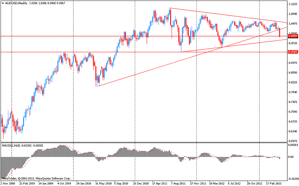Австралийский доллар упал до уровня паритета по отношению к американскому доллару после того, как Резервный банк Австралии на этой неделе снизил базовую процентную ставку до рекордно низкого уровня. Также сегодня РБА опубликовал квартальный отчет по курсу денежно-кредитной политики. Как стало известно, РБА понизил прогноз по инфляции на конец текущего года до уровня 2,25 процента, а прогноз роста ВВП оставлен без изменений - на уровне 2,5 процента, что находится в середине ранее прогнозировавшегося диапазона 2-3 процента. Относительно инвестиций в добывающую промышленность, Резервный Банк Австралии считает, что они останутся около текущих уровней в 2013-2014 годах., что является позитивным знаком, так как преобладающее мнение наблюдателей состояло в том, что следует ожидать их снижения. В заявлении также говорится, что прогноз экономического роста мало изменился по сравнению с первоначальным прогнозом, которые был представлен в феврале. Кроме того, ожидается, что рост ВВП будет немного ниже тренда в течение 2013 года, а в 2014 году рост ускорится до уровня, близкого к тренду. Достижение пика в инвестициях в добычу ресурсов, высокий курс австралийского доллара и продолжающаяся фискальная консолидация будут сдерживать рост до следующего года или около того, а низкий уровень процентных ставок поможет поддержать спрос, заявил РБА. Между тем, отчет показал, что рост занятости, как ожидается, будет умеренным в ближайшей перспективе. Прогнозируется, что уровень безработицы вырастет в период до следующего года, когда возвращение роста к тренду улучшит ситуацию на рынке труда.