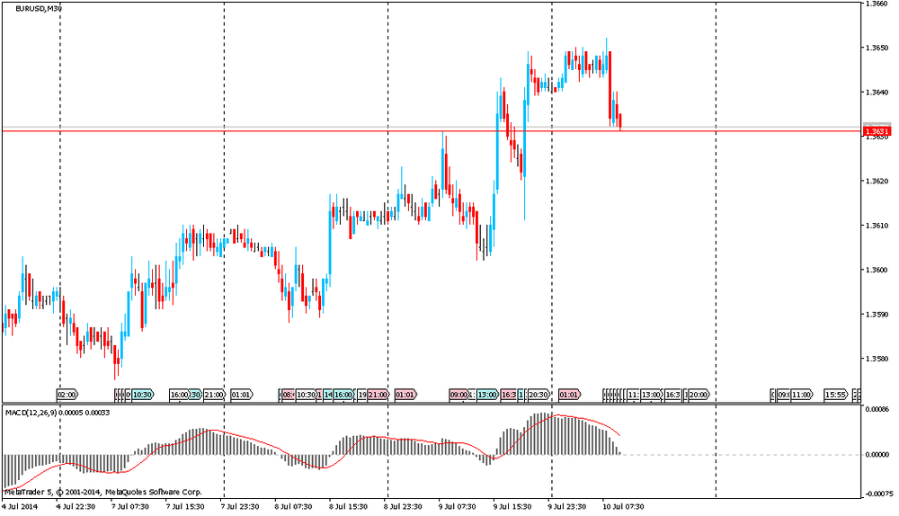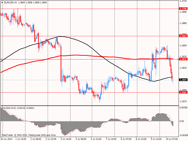 Евро упал к $1.3631, обновив сессионный минимум после выхода негативных данных по промпроизводству и инфляции во Франции. Объем промышленного производства во Франции в мае 2014 года упал на 1,7% по сравнению с предыдущим месяцем и на 3,7% относительно того же месяца 2013 года. Аналитики ожидали роста первого показателя на 0,2% и снижения второго на 1%.