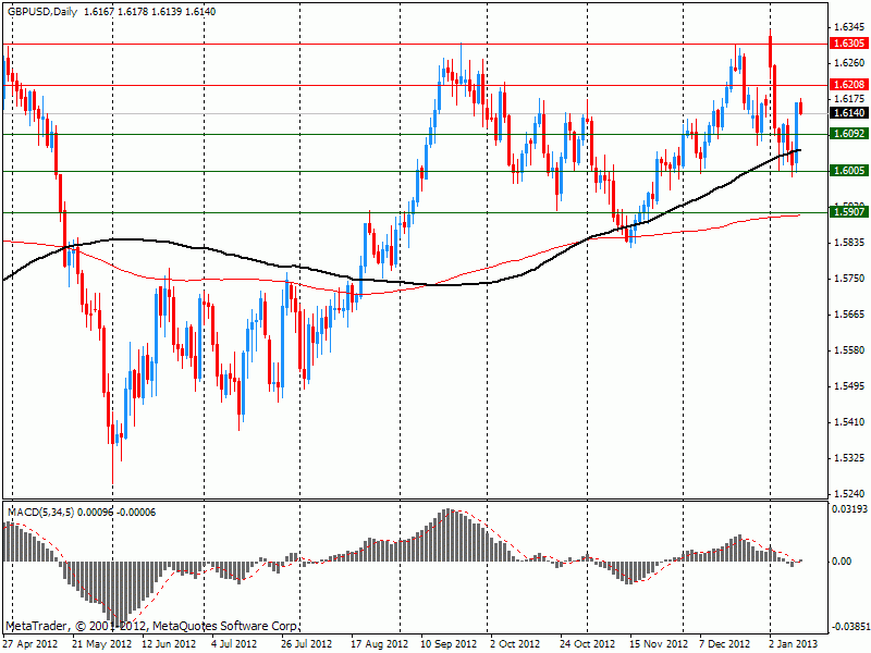 После ралли к максимуму $1.6169 на отчете по торговому балансу США (отразившему рост дефицита от $-42.06 млрд. до $-48.73 млрд. в ноябре против $-41.30 млрд. по прогнозам) продажи вернули пару GBP/USD к $1.6100 в ожидании отчета по ВВП Британии. Прогноз за прошедшие 3 месяца сократился на 0,3% в декабре, по данным NIESR. Ранее он отразил рост на 0,1%. Пара упала к минимуму $1.6087 на новостях.