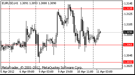 Единая валюта выросла по отношению к доллару после итогов размещения гособлигаций Германии и Италии. Министерство финансов Италии разместило казначейские векселя на три и 12 месяцев на общую сумму 11 миллиардов евро. При этом доходность по трехмесячным векселям, которых ведомство разместило на 3 миллиарда евро, поднялась до 1,249% с прежних 0,492%. Доходность по бумагам с погашением 12 апреля 2013 года, размещенным на сумму 8 миллиардов евро, увеличилась до 2,840% с 1,405% ранее. Правительство Германии в среду провело аукцион по размещению гособлигаций со сроком погашения через 10 лет на общую сумму 3,87 миллиарда евро, доходность по бумагам при этом опустилась до исторического минимума в 1,77%. Итоги аукциона оказались неудовлетворительными, поскольку планировалось привлечь 5,07 миллиарда евро. Кроме того, впервые с ноября прошлого года предложение по немецким гособлигациям превысило спрос.