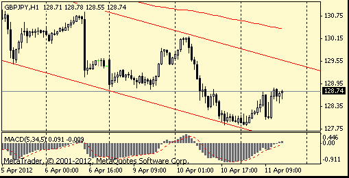 В данный момент пара торгуется в области сессионного максимума. Преодоление данного сопротивления откроет дорогу к верхней границе нисходящего канала, который четко прослеживается на часовом временном периоде и в данный момент ограничивает рост пары в области Y129,40.
