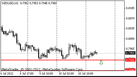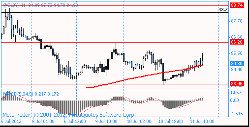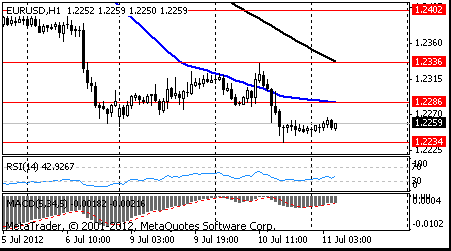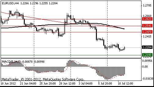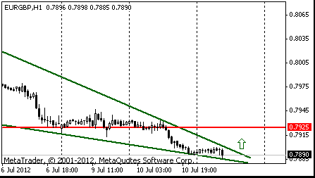 Пара в третий раз коснулась нижней границы нисходящего треугольника, и немного отступила. Ожидается, что пара продолжит свой рост, целью которого будет линия сопротивления треугольника. Пробитие данной линии может вызвать рост до значения $1,2405, на котором находится уровень 38,2% по FIBO ($1.2226-$1.2694). Также на этом значении находится максимум 06.07.2012 и минимум 26.06.2012, а вблизи данного уровня проходит линия сопротивления 29.06.2012 и 03.07.2012.