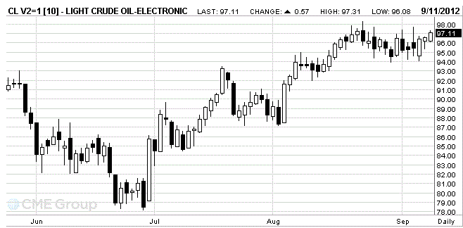 Стоимость октябрьских фьючерсов на американскую легкую нефть марки WTI (Light Sweet Crude Oil) на NYMEX составляет сейчас $97,11 за баррель.