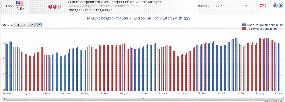 Как показали предварительные данные Reuters/Michigan, в октябре индекс потребительских настроений упал до уровня 75,2 пункта против сентябрьского значения 77,5 пункта. Средний прогноз предполагал снижение показателя до уровня 77,2 пункта.