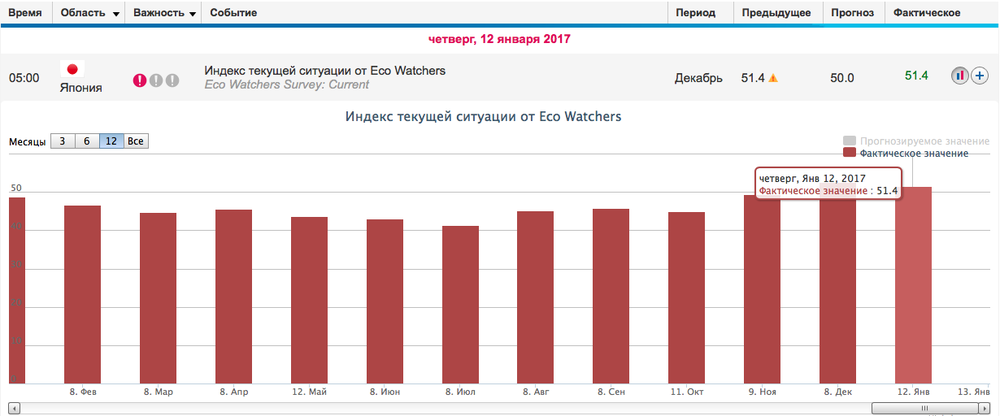 Согласно опубликованным сегодня данным кабинета министров Японии индекс текущей ситуации от Eco Watchers в декабре составил 51.4 и указал на стабильный результат. Напомним, что данный показатель измеряет настроение среди представителей тех профессий, которые обслуживают непосредственно потребителей: парикмахеры, водители такси, официанты и прочие. Любое значение выше 50 указывает на их оптимизм в экономике.