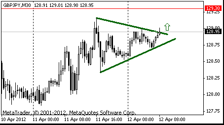 Если паре удастся преодолеть уровень сопротивления фигуры, то возможен дальнейший рост пары с целями Y129.30 (61.8% FIBO Y127.85-Y130.20), Y129.60 (76.4% FIBO Y127.85-Y130.20) и Y130.00 (161.8% FIBO Y127.85-Y129.15).