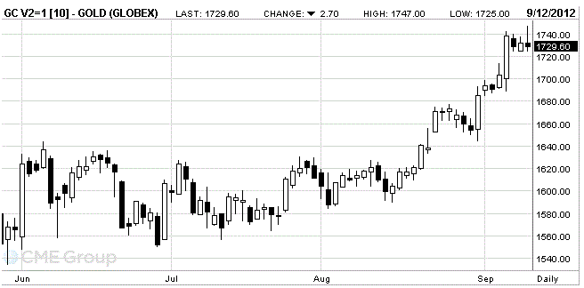 В течении дня фьючерсы на золото выросли, обновив при этом шестимесячный максимум на фоне ослабление доллара, который снизился после того, как немецкий Конституционный суд признал фонд ESM конституционным. Однако ввел определенные условия. Конституционный суд Германии постановил, что немецкий вклад в ESM не должен превышать 190 млрд. евро, но если сума будет большее, то будет надо согласие нижней палаты бундестага. Цены выросли до уровня $1,749.50 за тройскую унцию после того, как Высокий суд постановил, что Германия может ратифицировать Европейский механизм стабильности.