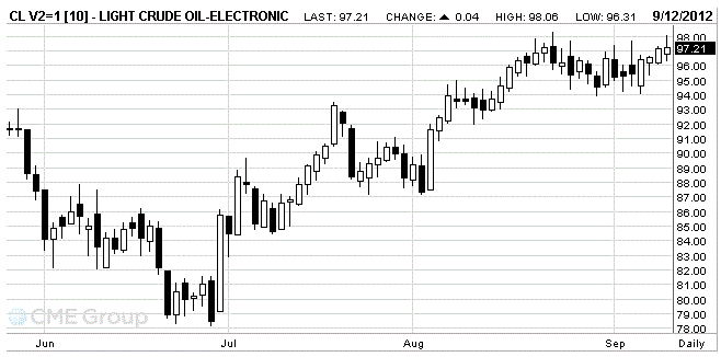 Стоимость октябрьских фьючерсов на американскую легкую нефть марки WTI (Light Sweet Crude Oil) на NYMEX составляет сейчас $97,22 за баррель.
