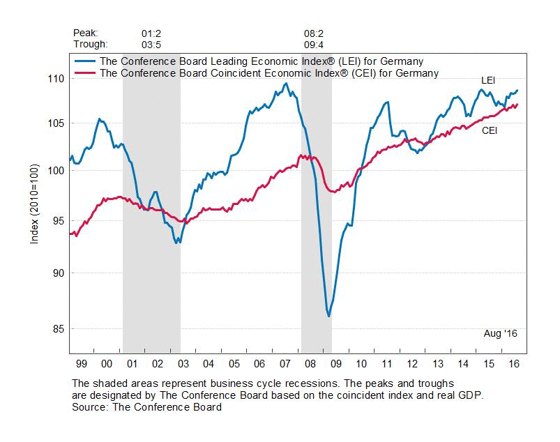 Результаты исследований, опубликованные Conference Board, показали: по итогам августа ведущий экономический индекс (LEI) для Германии увеличился на 0,3 процента, до уровня 108,6 пункта (2010=100) после повышения на 0,1 процента в июле и падения на 0,1 процента в июне. В течение шести месяцев (с февраля по августу 2016 года) показатель вырос на 1,7 процента по сравнению с повышением на 1,1 процента за предыдущий шестимесячный период (с января по июль 2016 года).