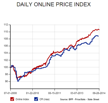 Ведущиеся обоснованные дебаты вокруг корректировок гедонистического качества (Hedonic Quality Adjustments) трудно оценить из-за отсутствия сопоставимых индексов потребительских цен. Однако некоторые из них всё же имеют место, и сегодня мы рассмотрим индекс, составленный PriceStats - частью проекта миллиарда цен Массачусетского технологического института (Billion Prices Project), который собирает в интернете цены и ежедневно публикует значение показателя, предназначенного для отслеживания инфляции в режиме реального времени.