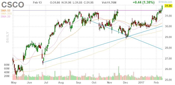 На текущий момент акции Cisco Systems, Inc. (CSCO) котируются по $31,95 (+1,98%)