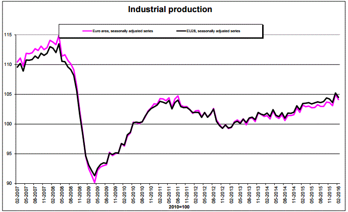 Сегодня в 09:00 GMT в еврозоне выйдет промышленное производство. Показатель отражает изменение объема выпуска в обрабатывающей и добывающей промышленности, лесном хозяйстве и производстве электричества. Высокие или повышающиеся значения индикатора свидетельствуют о развитии экономики. Несмотря на то, что производство в структуре ВВП занимает меньшую долю, чем сервисный сектор, показатель является хорошим индикатором состояния экономики региона. Ожидается, что показатель в феврале составит -0,7% м/м и +1,2% г/г.