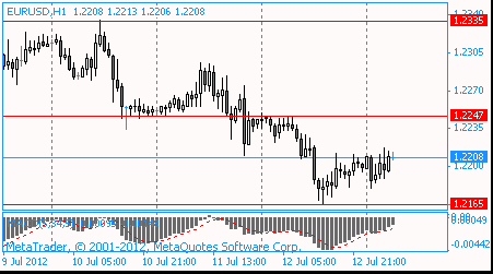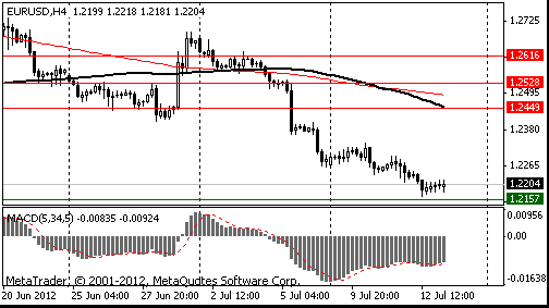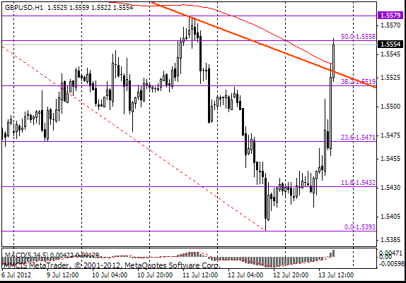 Курс EUR/USD резко вырос, пробив при этом линию сопротивления, которая также выступает верхней границей нисходящего канала. Сейчас уже можно говорить, что пара смогла закрепится выше этой линии. Следующей целью для роста является уровень 23,6% по Фибо ($1.2160-1.2695$) со значением 1.2290. Преодоление этого значения может открыть дорогу к уровню 1,2365 (38,2% по Фибо), который пересекает линия сопротивления от 29.06.12 и 03.07.12. Также здесь проходит МА(200) для Н1.
