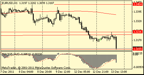 Падение евро продолжилось на фоне снижения спроса на итальянские облигации. Вчера Италия продала 7 млрд. евро ($ 9,3 млрд) со сроком один год, под 5.95% процента доходности, по сравнению со средней доходностью в 2.70% процента по итогам последних пяти лет. Ценные бумаги упали даже после того, как Европейский центральный банк, как сообщается, купил часть долга страны. Италия должна будет погасить около 53 миллиардов евро в первом квартале 2012 года, что составляет около трети общего объема облигаций с таким же сроком погашения в регионе. Таким образом евро упал более чем на 1.5% процента, до $1.3160. Это самый низкий уровень с 4 октября.