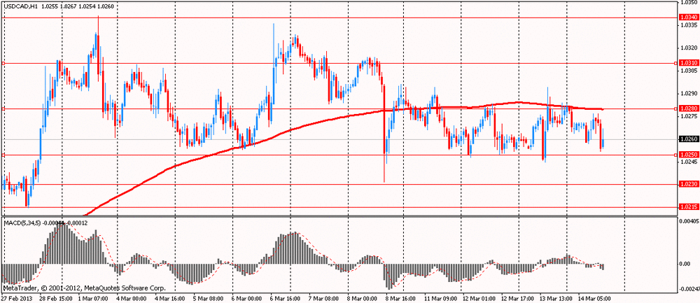 В настоящий момент пара отступила от внутридневного минимума C$1.0252 в область C$1.0260. Ближайшая поддержка расположена на C$1.0230 (минимум 8 марта) и C$1.0215 (минимум 28 февраля), а сопротивление – на C$1.0280 (МА(200) для Н1), C$1.0310 (максимум 4 марта) и C$1.0340 (максимум 1 марта).