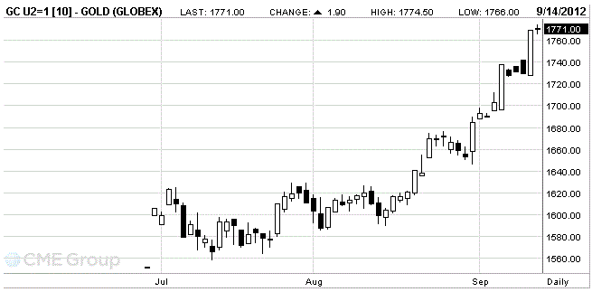 Стоимость октябрьского фьючерса на золото на COMEX составляет сейчас 1771.1 доллара за унцию.
