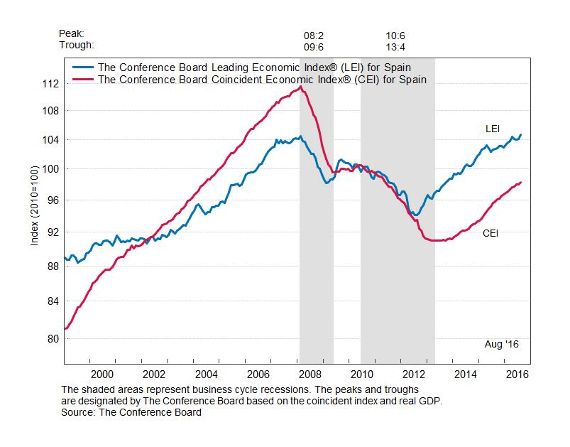 Результаты исследований, опубликованные Conference Board, показали: по итогам августа ведущий экономический индекс (LEI) для Испании увеличился на 0,5 процента, до уровня 104,6 пункта (2010=100) после повышения на 0,1 процента в июле и падения на 0,1 процента в июне. В течение шести месяцев (с февраля по август 2016 года) показатель вырос на 1,0 процента по сравнению с повышением на 0,8 процента за предыдущий шестимесячный период (с января по июль 2016 года).