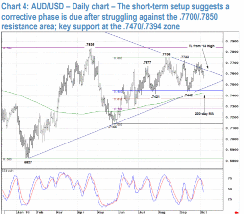 "В то время как среднесрочный восходящий тренд для AUD/USD по-прежнему сохраняется, текущая ситуация позволяет предположить, что фаза коррекции весьма близка, учитывая ухудшение краткосрочного технического фона. С этот точки зрения, недавние попытки преодолеть следующую зону критического сопротивления выделяют растущий риск отката пары. В связи с этим, на данный момент потенциал роста к области сопротивления 0,7700 / 0,7850 ограничен. Данная область включает в себя линию нисходящего тренда от максимумов 2013 года - максимумов августа и апреля - а также 76,4% отката от максимума 15 мая, и 38.2% от пика 2014 года. Учитывая это сильное слияние сопротивлений, мы полагаем, что рост пары будет сталкиваться с жесткими препятствиями. Обратите внимание, что эта точка зрения также согласуется с нахождением индикатора в зоне перекупленности и образованием дивергенции. Тем не менее, мы продолжаем отслеживать ключевые уровни поддержки для подтверждения устойчивой фазы коррекции, учитывая подобные медвежьи структуры начиная с первого квартала.