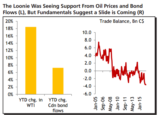 "Несмотря на разочаровывающие экономические данные, канадский доллар укрепился на 7% с начала года до настоящего времени. Причиной такой динамики был 18- процентный рост цен на нефть WTI с начала года, и усиление чистых иностранных покупок канадских государственных облигаций в этом году. Тем не менее, скоро ситуация для канадской валюты может изменится. Расширяющийся дефицит торгового баланса Канады не демонстрирует никаких признаков улучшения и трейдеры все чаще учитывают в цене возможность снижения процентной ставки. Кроме того, ожидаемое возобновление уверенного роста ВВП США в третьем квартале должно подтолкнуть ФРС к повышению ставки в декабре. Что касается Банка Канады, многие аналитики ожидают сохранения текущих настроек денежно-кредитной политики в обозримом будущем. На фоне этого пара USD/CAD может вернутся до уровня $1,35, на котором она в последний раз торговалась в начале марта", - отметили аналитики.