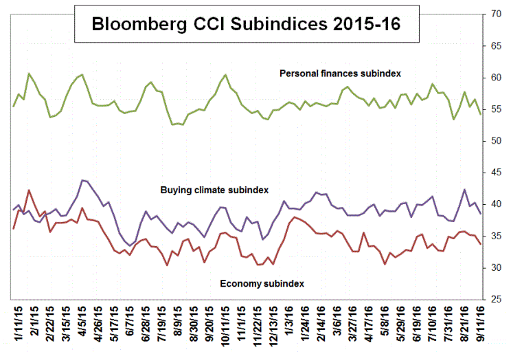 Согласно данным, за неделю, завершившуюся 11 сентября, индекс потребительского комфорта опустился до 42,2 пункта с 44,0 пункта неделей ранее (по 4 сентября). Учитывая последнее изменение, показатель опустился ниже среднего значения 2016 года (43,4 пункта). Долгосрочное среднее значение, которое рассчитывается с конца 1985 года, составляет 41,7 пункта.