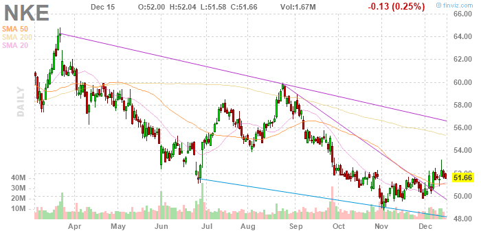 Nike (NKE) остается ведущим мировым производителем спортивной одежды и обуви. Компания отчитывалась о прибыли лучше прогнозов аналитиков в течение четырех кварталов подряд, но, тем не менее, стоимость акций компании за это время снизились.