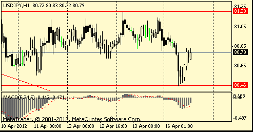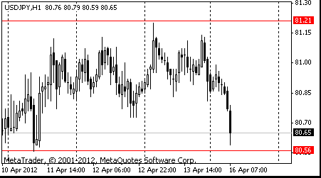 Пара показала минимум на Y80,28. Ниже поддержка отмечена на Y80,20 (минимум 29 февраля). Значительное скопление ордеров на покупку отмечено в области Y80,10/00.