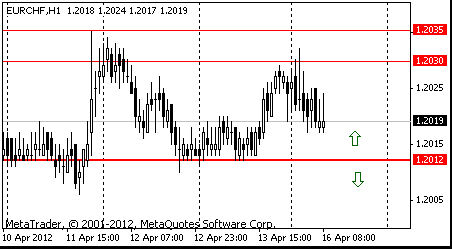 На часовом графике пара EUR/CHF приближается к ключевой линии поддержки Chf1.2012 (минимум 13 апреля):
