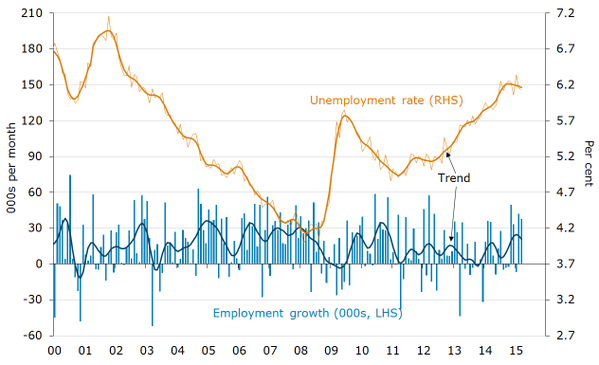 В настоящее время рынок труда, кажется, в хорошей форме. Тем не менее, вряд ли это будет устойчивым. В данный момент экономика получает одномоментное ускорение из-за эффекта снижения цен на бензин, однако он вскоре будет начинать исчезать. Более того, эффект более низких цен на австралийский сырьевой экспорт пока не распространился по экономике, а инвестиции в горнодобывающем секторе продолжают снижаться.