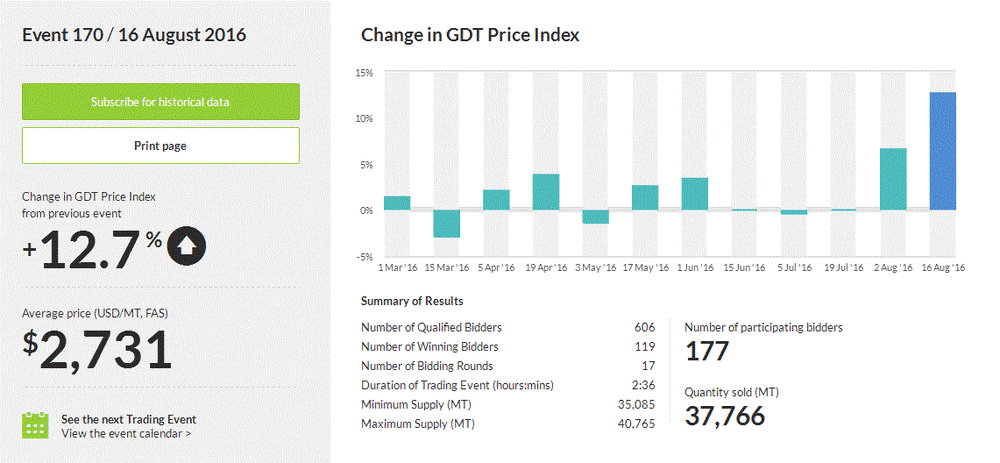 Как стало известно, стоимость молочной продукции увеличилась на 12,7% после того, как выросла на 6,6% в ходе предыдущего аукциона. Стоит подчеркнуть, последнее повышение оказалось самым значительным с середины сентября 2015 года. В преддверии данного аукциона широко ожидалось, что цены сильно вырастут, причем цельное сухое молоко, согласно оценкам, должно было подорожать на 10%. Результаты аукциона показали, что стоимость цельного сухого молока выросла на 18,9%.
