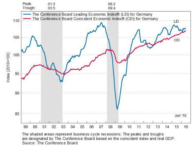 Результаты исследований, опубликованные Conference Board, показали: по итогам июня ведущий экономический индекс (LEI) для Германии снизился на 0,1 процента, до уровня 107,6 пункта (2010=100) после роста на 0,3 процента в мае и сокращения на 0,2 процента в апреле. В течение шести месяцев (с декабря 2015 года по июнь 2016 года) показатель увеличился на 0,5 процента по сравнению с ростом на 0,3 процента за предыдущий шестимесячный период (с ноября 2015 года по май 2016 года).