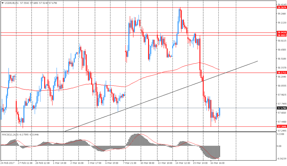 На открытие торгов пара USD/RUB немного выросла на 10 копеек к уровню ₽57.68. Пара пытается немного корректироваться после 2-х дневного снижения. Тем не менее, даже общее укрепление американской валюты после заседания ФРС не может помочь совершить такую коррекцию. В целом USD/RUB вчера пробила поддержку восходящего канала от 15 февраля и по этой причине на данный момент лучше присматриваться к продажам пары на ретесте этого уровня. Сильным сопротивлением по паре выступает максимум вчерашнего дня и MA 200 H1 - ₽58.25.
