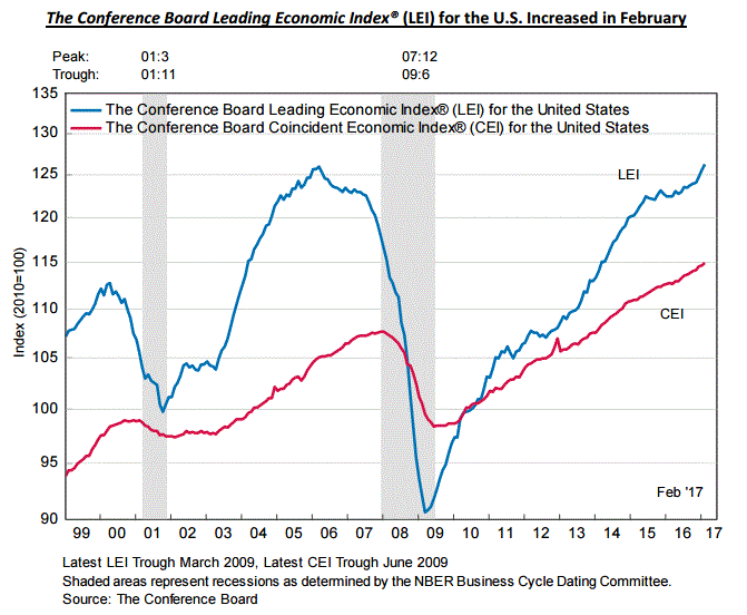 "После шести последовательных ежемесячных повышений, ведущий индекс находится на самом высоком уровне в течение десяти лет. Улучшение суб-индексов показателя на широкой основе указывает на более позитивные экономические перспектив на 2017 год, хотя рост ВВП, вероятно, останется умеренным. Только суб-индекс разрешений на строительство жилья оказал отрицательное воздействие на ведущий индекс в феврале, компенсировав прирост за предыдущие два месяца", - сказал Атаман Озиилдирим, директор по бизнес-циклам в Conference Board.