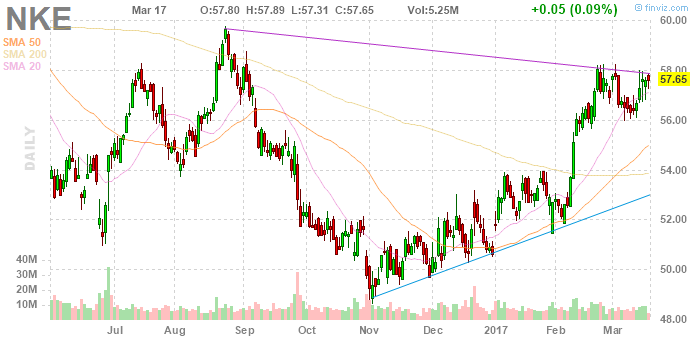 Nike Corporation (NKE) планирует опубликовать отчет за 3 квартал 2017 года после закрытия рынка во вторник, 21 марта. Производитель спортивной обуви и одежды оценивается в $10,7 млрд, что делает его самым ценным брендом среди спортивных предприятий. Nike является компонентом S&P 500 и был добавлен к Dow Industrial Average в 2013 году.