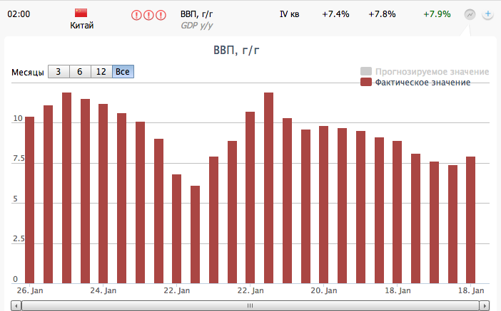Курс швейцарского франка упал до минимума ко всем основным мировым валютам после публикации положительной макроэкономической статистики из КНР, что привело к росту фондовых индексов азиатского региона. Показатели указали на ускорение темпов роста ВВП в четвертом квартале до 7,9% с 7,4% в третьем квартале при прогнозировавшемся повышении до 7,8%. На фоне этой статистики спрос на валюты-убежища сократился.