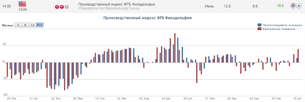 Как показал отчет ФРС-Филадельфия, в июне индекс деловой активности вырос до 19,8 против 12,5 в июне. Значение показателя максимальное с марта 2011 года. Экономисты ожидали, что индекс снизится до 6,9.