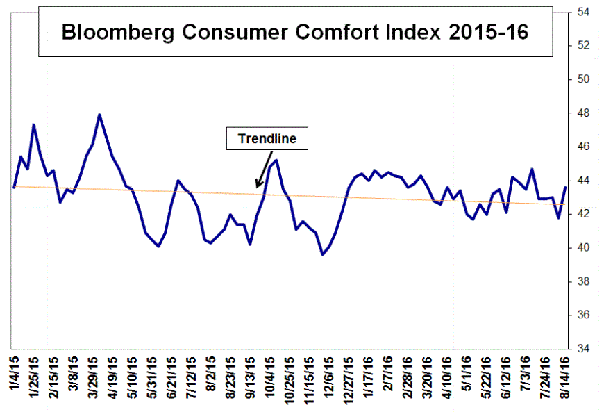 Согласно данным, за неделю, завершившуюся 14 августа, индекс потребительского комфорта поднялся до 43,6 пункта по сравнению с 41,8 пункта неделей ранее (по 7 августа). Учитывая последнее изменение, показатель оказался выше среднего значения 2016 года (43,4 пункта).
