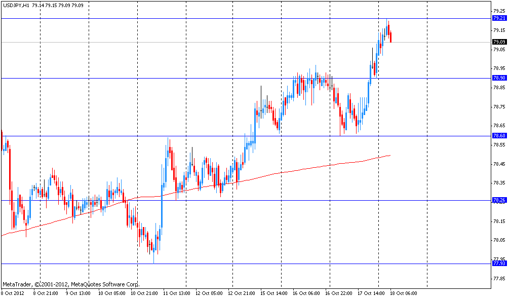 Давление на японскую валюту оказывает и то, что 30 октября центральный банк страны может принять очередной пакет мер по стимулированию экономики. В конце месяца члены правления Банка Японии будут рассматривать бюджетные проекты на 2012-2013, а также прогнозы на год, начиная с апреля 2014 года. Данные, вероятно, будут отражать розничные цены, исключая свежие продукты, которые выросли менее чем на 1%, сообщают официальные источники при условии анонимности, так как обсуждения являются частными. Ситуация будет означать провал монетарной политики Банка Японии по целевому уровню инфляции в 1 процент.