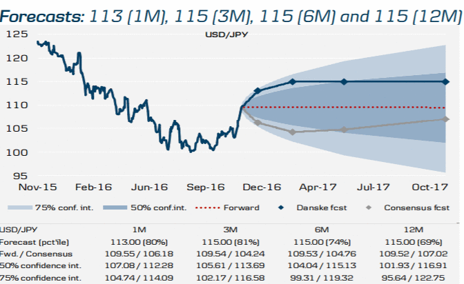 "Пара USD/JPY значительно выросла после того, как Дональд Трамп был избран следующим президентом США. В краткосрочной перспективе, мы считаем, что пара USD/JPY, скорее всего, будет по- прежнему поддерживаться за счет улучшения аппетита к риску и ожиданий повышения ставки ФРС в декабре. Ввиду этого, мы повысили наши прогнозы по паре USD/JPY до Y113 c Y104 для 1-месячной перспективы и до Y115 c Y106 для 3-месячной перспективы. В среднесрочной перспективе , в случае более высокой доходности 10-летних гособлигаций США и высоких цен на сырье усилится рост инфляционных ожиданий в США, что будет выступить фактором поддержки для пары USD/JPY. Таким образом, в то время как лежащее в основе курса иены давление, вытекающие из, среди прочего, большого профицита счета текущих операций, вероятно, останется без изменений. Также мы ожидаем, что репатриация прибылей в США будет способствовать дальнейшему оттоку портфельных инвестиций из Японии, который, в сочетании с более высокими затратами по хеджированию на рынке FX по долларовым активам, может оказать давление на иену. Теперь мы ждем, что пара USD/JPY достигнет Y115 (ранее Y106) в 6-месячной перспективе и Y115 (ранее Y106) в 12-месячной перспективе. Для более долгосрочных прогнозов, мы видим достаточно сбалансированные риски, но неопределенность необычно высока , учитывая многие неизвестные факторы экономической политики США при новом президенте", - заявили эксперты.