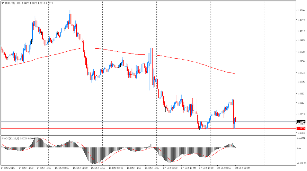 Евро значительно подешевел против американской валюты, достигнув минимума 7 декабря. Инвесторы снова стали покупать доллар после того, как ФРС повысила процентную ставку и просигнализировала о том, что последующие повышения ставок будут производиться постепенно и будут зависеть от экономических данных. Хотя решение FOMC практически полностью совпало с рыночными ожиданиями, оно все же оказало поддержку курсу доллара. "ФРС ожидает такого развития экономической ситуации, которое будет требовать лишь постепенного повышения ключевой процентной ставки", - говорится в заявлении ФРС. Согласно новому срединному прогнозу 17 руководителей ФРС, они ожидают, что ключевая процентная ставка к концу 2016 года будет повышена до 1,375%, к концу 2017 года - до 2,375%, а к концу 2017 года она достигнет 3,25%. Это подразумевает четыре повышения ставки на четверть процентного пункта в следующем году, четыре повышения в 2017 году и три или четыре повышения в 2018 году. Это более медленные темпы повышения, чем руководители центрального банка прогнозировали в сентябре, и намного более медленные по сравнению с предыдущими циклами повышения ставок.