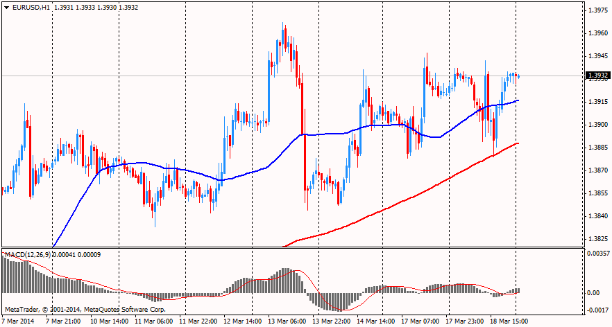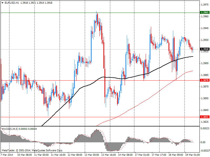 Вчера курс евро незначительно вырос против доллара. Изначально на ход торгов повлияли слабые данные по еврозоне и Германии, но активные покупки на спаде и слова президента РФ Путина способствовали заметному росту. Тем не менее, представленные позже данные по США вернули евро до прежних уровней. В начале американской сессии EUR/USD обновил сессионный минимум, после чего совершил отскок и вернулся за пределы отметки $1.3900 на возобновившемся беспокойстве по поводу ситуации в Крыму.