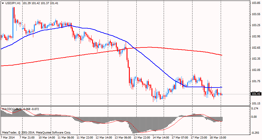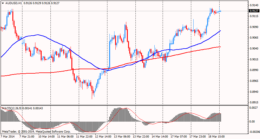 Иена торговалась с заметным повышением против доллара США. Рынки продолжают муссировать тему Крыма, и, по последним сведениям, российский президент Владимир Путин подписал указ о признании Республики Крым суверенным и независимым государством, что создает предпосылки для присоединения полуострова к России. В свете сложившейся ситуации ЕС и США наложили санкции против определенных официальных лиц России и Украины, их число составило 21 человек. По словам Европы и Америки, эти люди виновны в посягательстве на суверенитет Украины. В этот список российский президент Путин не попал, хотя ожидается введение дальнейших санкций в случае продолжения интервенции со стороны России. Рынки сохраняют относительное спокойствие, а валюты-убежища остановили ралли. В целом для рынков ситуация в Крыму предполагает сохранение сценария «выжидательной позиции».