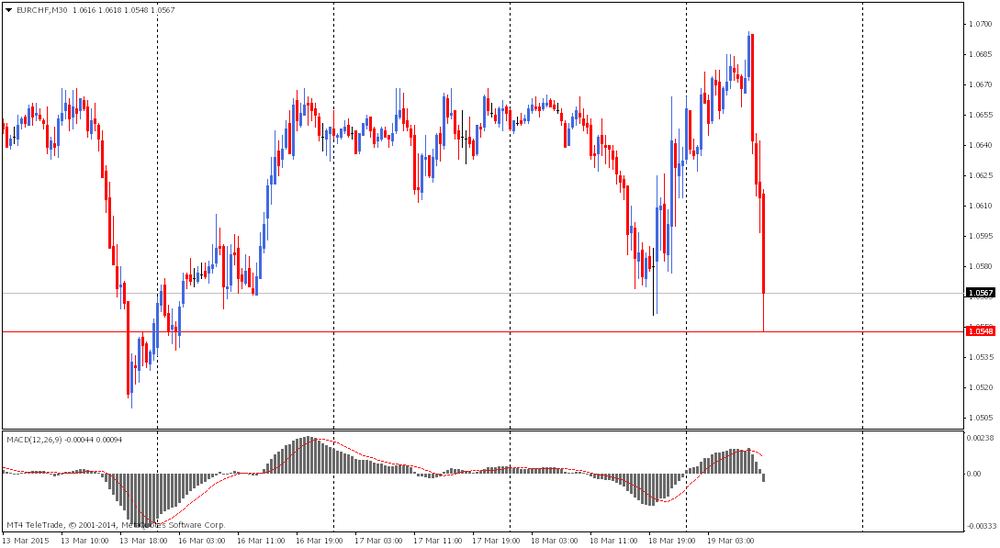 Швейцарский франк демонстрирует заметное снижение против американской валюты, но отступил от дневного минимума после решения ШНБ, который предпочел занять выжидательную позицию и понаблюдать за эффектами январской отмены привязки франка к евро. Напомним, ШНБ оставил целевой диапазон по 3-месячной ставке Libor на прежнем уровне между -1.25% и−0.25%. Депозитная ставка осталась на отметке -0.75%. В заявлении по монетарной политике ЦБ отметил существенную переоцененность франка и необходимость его снижения, пообещав продолжать наблюдение за валютным курсом и его влиянием на инфляцию и экономику, а в случае необходимости - проявлять активность на валютном рынке. Прогнозы по ВВП инфляции были пересмотрены на понижение. Теперь ШНБ ожидает, что в 2015 году реальный ВВП страны вырастет лишь на неполный 1% против декабрьской оценки 2%. Прогноз по инфляции на этот год был понижен на 1% до -1.1%. Пиковый минимум (-1.2%) будет достигнут в 3-м кв., а рост показателя, как ожидается, будет зафиксирован лишь в 2017 году - на уровне +0.4%.