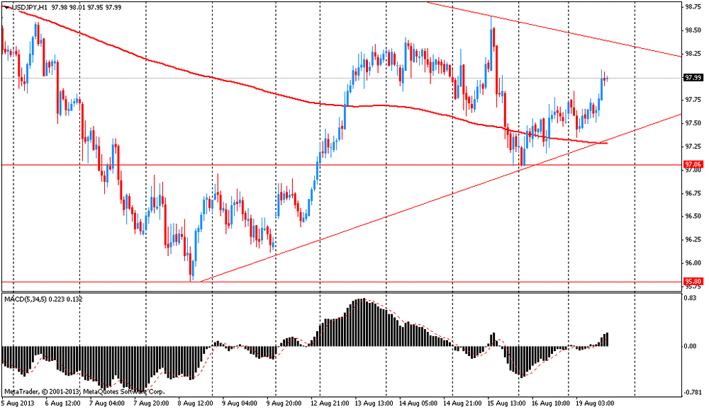 Доллар США торгуется стабильно против японской иены, получая поддержку со стороны роста доходности казначейских облигаций США, наблюдавшегося в конце прошлой недели. В начале торгов паре было сложно обрести определенное направление, так как в краткосрочной перспективе важных событий не ожидается. Объем торгов был несколько низким, что объясняется сезоном отпусков. "Рост доходности казначейских облигаций США оказал поддержку американской валюте, но разговоры о сворачивании программы покупки облигаций со стороны ФРС оказывают давление на акции и валюты развивающихся экономик, ухудшая отношение инвесторов к риску и повышая привлекательность иены. Таким образом, происходит своеобразное перетягивание каната", - отмечают в банке, прогнозируя, что в течение дня пара будет находиться в диапазоне Y97-98.