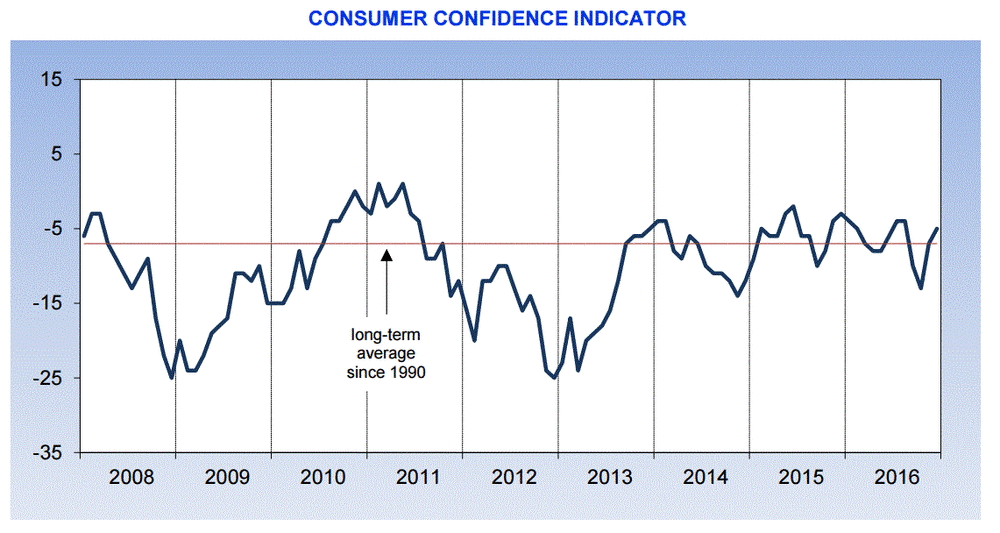 Согласно отчету ANZ, общий индикатор доверия, сочетающий в себе бизнес и потребительские настроения, указывает на рост ВВП с ускорением нынешних темпов 3½%. Четыре процента роста находится в пределах досягаемости. Инфляционные ожидания, в годовом исчислении, находится на уровне 1,6%.