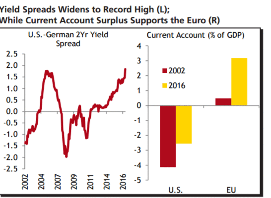 "Пара EUR/USD торгуется выше отметки $1,00 примерно 13 лет. Однако, последние тенденции указывают, что евро начинает активно двигаться в сторону паритета по отношению к доллару США. Снижение пары EUR/USD связано с недавним укреплением доллара США, которое было вызвано увеличением доходности облигаций, а также расширением спреда доходности между американскими и немецкими 2-летними облигациями до самого высокого уровня за десятилетие. Тем не менее, существует компенсационная сила, которая может помешать паре EUR/USD достигнуть уровня паритета в ближайшей перспективе. Профицит счета текущих операций в еврозоне не только велик, он гораздо выше (по отношению к ВВП), чем когда евро торговался ниже паритета еще в 2002 году. Поскольку перспективы фискальной и денежно-кредитной политики ФРС уже во многом учтены в ценах, текущий профицит счета текущих операций в еврозоне должен помочь евро постепенно восстанавливать некоторые утраченные позиции в 2017 году", - отметили эксперты.