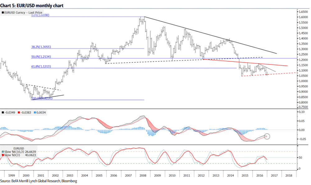 "Уже почти год пара EUR/USD торгуется вблизи многолетних минимумов. В декабре прошлого года было достаточно технических доказательств того, что пара предпочтет восходящую тенденцию. Однако, на этот раз более вероятным кажется продолжения падения пары EUR/USD. Если 2016 год пара завершит ниже основной поддержки $1.0450-$1.05, такая ситуация может быть технически "разрушительной" для 2017 года, поскольку это будет означать продолжение снижения с 2014 года. Пара удерживалась выше основной области технической поддержки $1.0450-$1.05 около двух лет, но на прошлой неделе все-таки сумела преодолеть данную область. Наш ежедневный график указывает на тенденцию к снижению и продолжение формирования медвежьей модели "флаг", которая может привести к длительному падению. Данная модель может обвалить пару до $1.0275 или даже $0.9980. Измерение движения на основе величины нисходящего тренда с апреля по ноябрь также предполагает, что EUR/USD может направится к уровню паритета", - заявили эксперты.