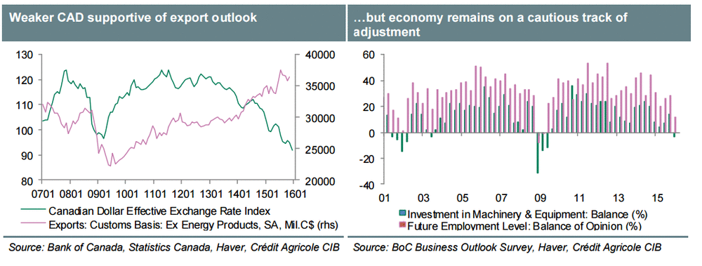 По мнению Банка Канады, экономический рост в стране в 4-м квартале 2015 года, вероятно, остановился "ввиду временного ухудшения экономики США, невысокого инвестирования компаний и ряда других временных факторов". Кроме того, в центральном банке страны полагают, что в настоящее время экономика Канады находится в самой середине переходного процесса, в ходе которого экономика переориентируется с экспорта энергоносителей на отрасли, не связанные с ресурсами. Рост активности в несырьевых отраслях обусловлен увеличением спроса со стороны США, понижением канадского доллара и мягкой политикой как в денежно-кредитной, так и в налогово-бюджетной сферах.